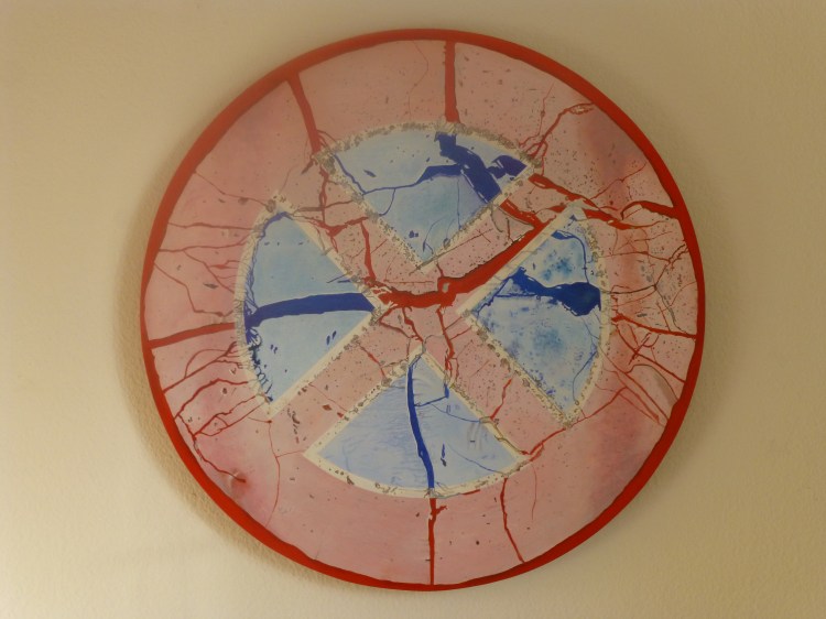 Durchmesser 40cm, Papier auf MDF, Sprayfarbe, Grundierfarbe, Karton, Metallschrauben