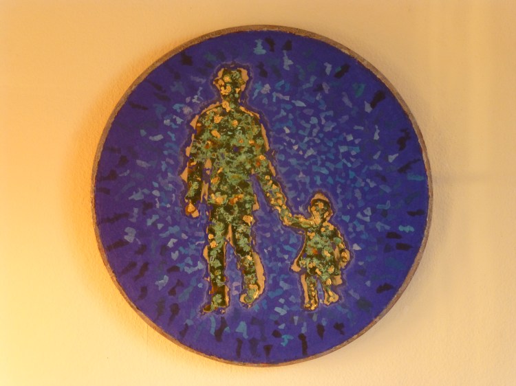 Durchmesser 60 cm, Fotokopie auf MDF, Sand, Strukturpaste, Ölfarbe