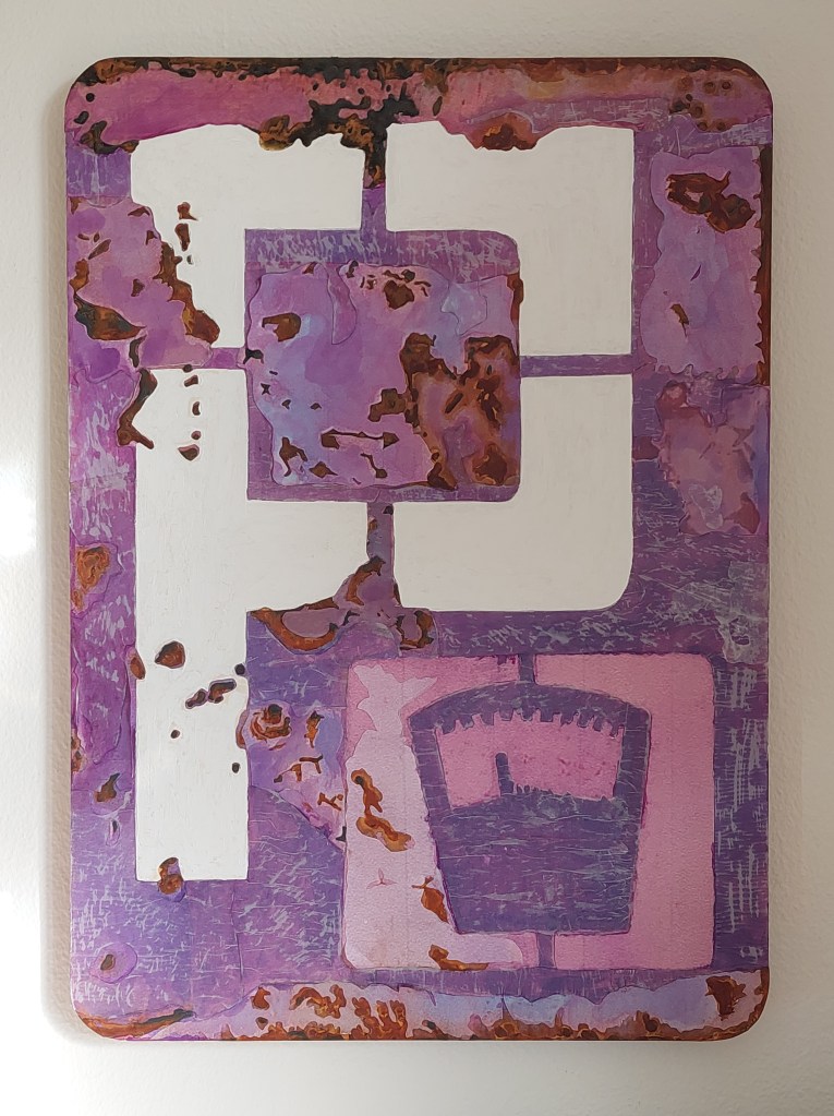 Seitenlänge 58 cm, Fotokopie auf MDF, Strukturpaste, Acrylfarbe, Oxidationsfarbe
